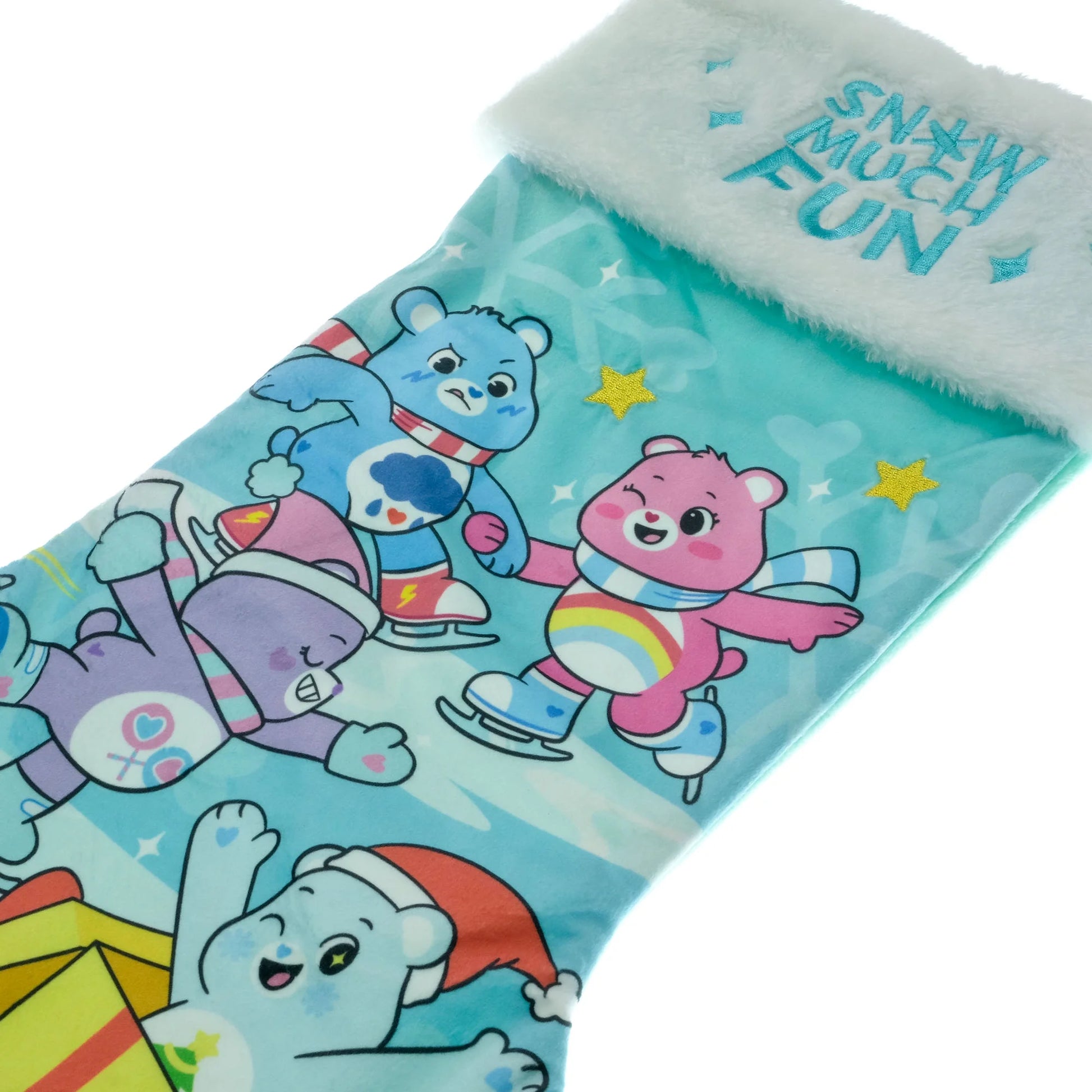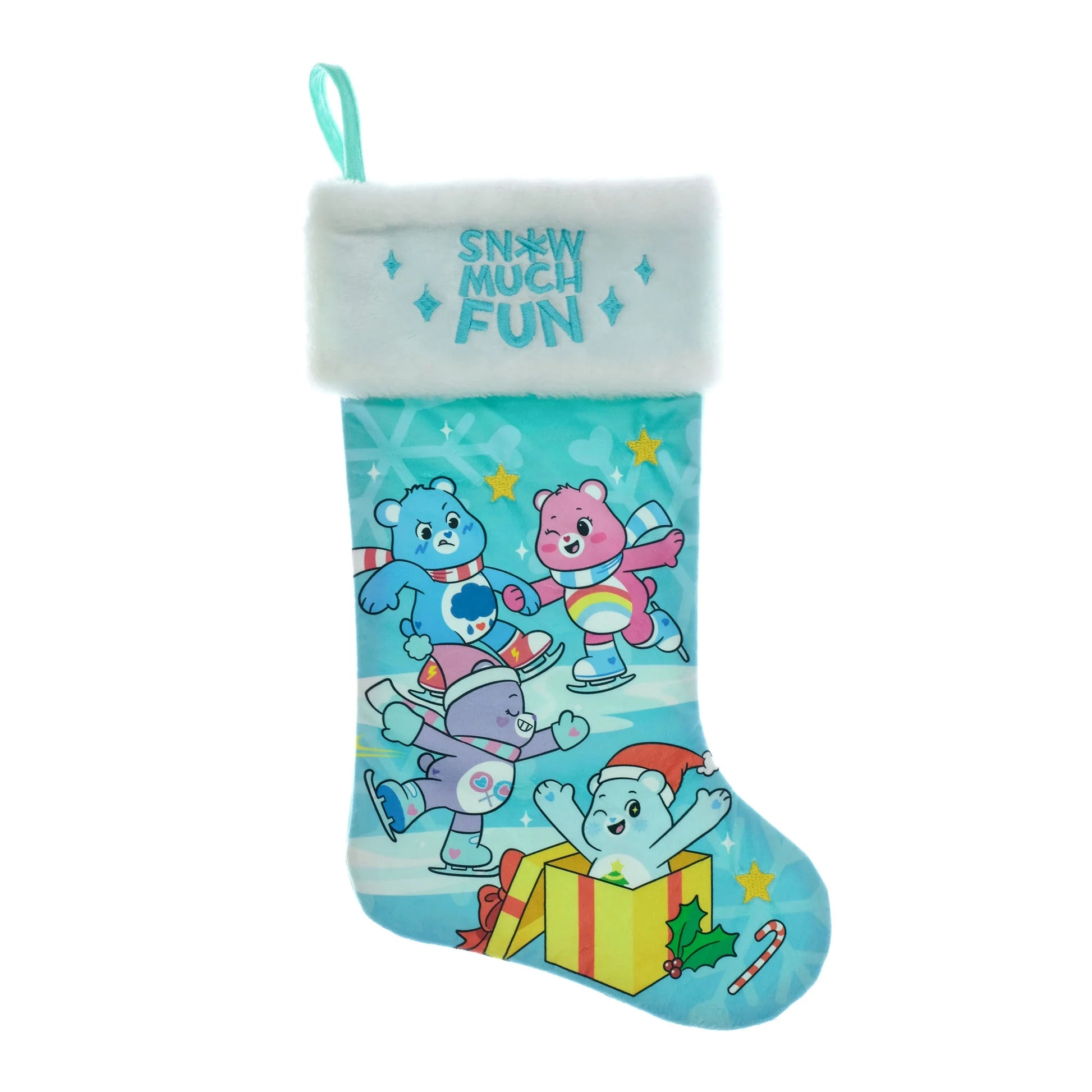 Add some joy to your holiday traditions with this 20 inch Care Bears Christmas Stocking. This charming stocking showcases your beloved Care Bears in a joyous winter scene. The light blue backdrop is adorned with cheerful snowflakes and stars. A perfect mix of nostalgia and fun, it features the phrase 'Snow Much Fun' embroidered on the cuff, bringing the Care Bears' message of love and happiness into your home. Whether a lifelong enthusiast or introducing a new fan, it's sure to be a heartwarming addition to your festive decor.