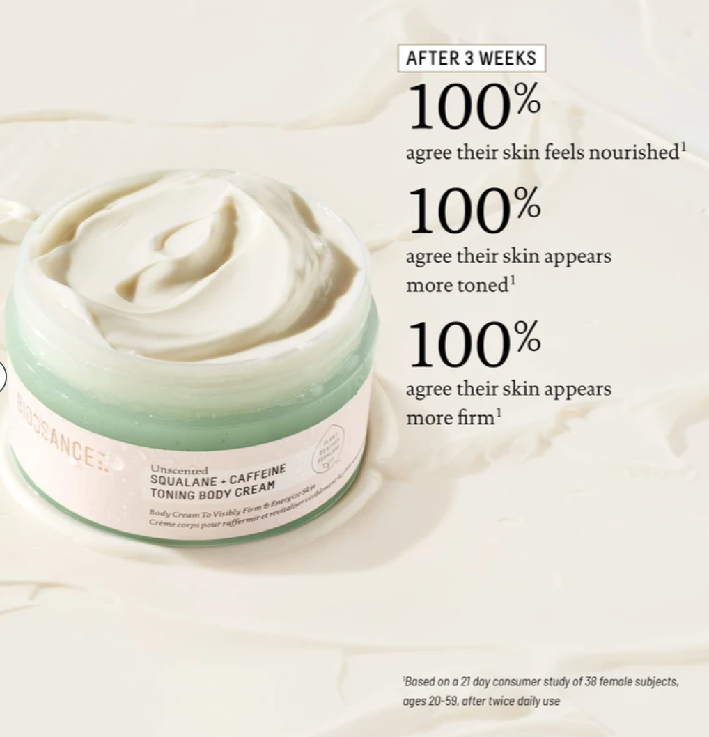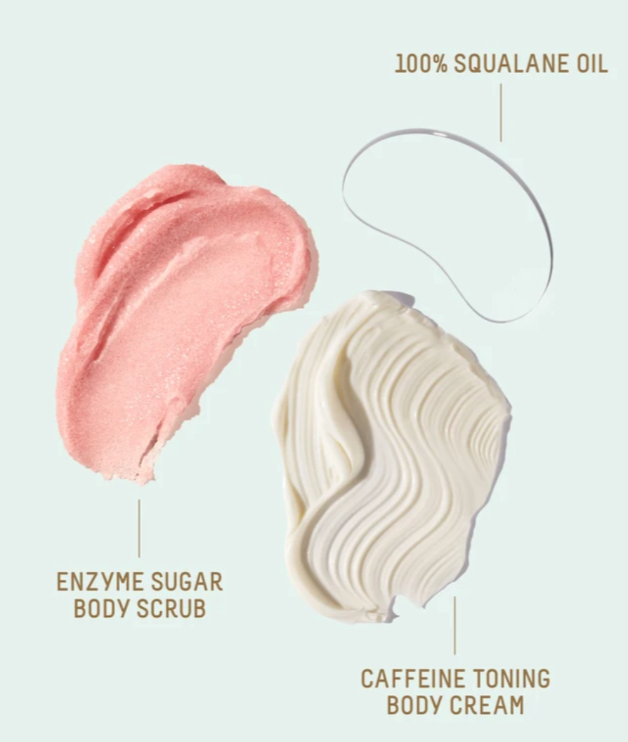 Squalane + Enzyme Sugar Body Scrub: Sucrose, Glycerin, Water/Aqua/Eau, Squalane, Cetearyl Olivate, Sorbitan Olivate, Lactobacillus/Punica Granatum Fruit Ferment Extract, Rosa Canina (Rosehip) Seed Oil, Rosa Gallica (Rose) Flower Powder, Vaccinium Macrocarpon (Cranberry) Fruit Powder, Propanediol, Citrus Aurantium Dulcis (Orange) Peel Oil, Leuconostoc/Radish Root Ferment Filtrate, Lavandula Angustifolia (Lavender) Oil, Lavandula Hybrida Oil, Xanthan Gum, Anthemis Nobilis Flower Oil, Ethylhexylglycerin, Potassium Sorbate, Mica, Limonene, Linalool, Iron Oxide (CI 77491) Caffiene Toning Body Cream: Water/Aqua/Eau, Squalane, Caprylic/Capric Triglyceride, Glycerin, Sorbitan Olivate, Cetearyl Olivate, Jojoba Esters, Behenyl Alcohol, Cetyl Palmitate, Caffeine, Niacinamide, Plankton Extract, Sorbitan Palmitate, Hydroxyethyl Acrylate/Sodium Acryloyldimethyl Taurate Copolymer, Tocopherol, Sodium Gluconate, Ethylhexylglycerin, Phenoxyethanol, Citric Acid.
