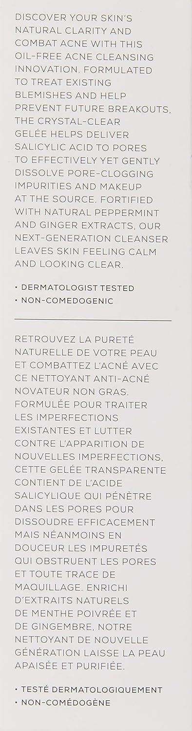 Discover your skin's natural clarity and combat acne with this innovative oil-free acne facial cleanser. Formulated to treat existing blemishes and help prevent future breakouts, the crystal-clear gelee helps deliver Salicylic Acid to pores to effectively yet gently dissolve pore-clogging impurities and makeup at the source. Fortified with natural Peppermint and Ginger Extracts, our next-generation cleanser leaves skin feeling calm and looking clear.