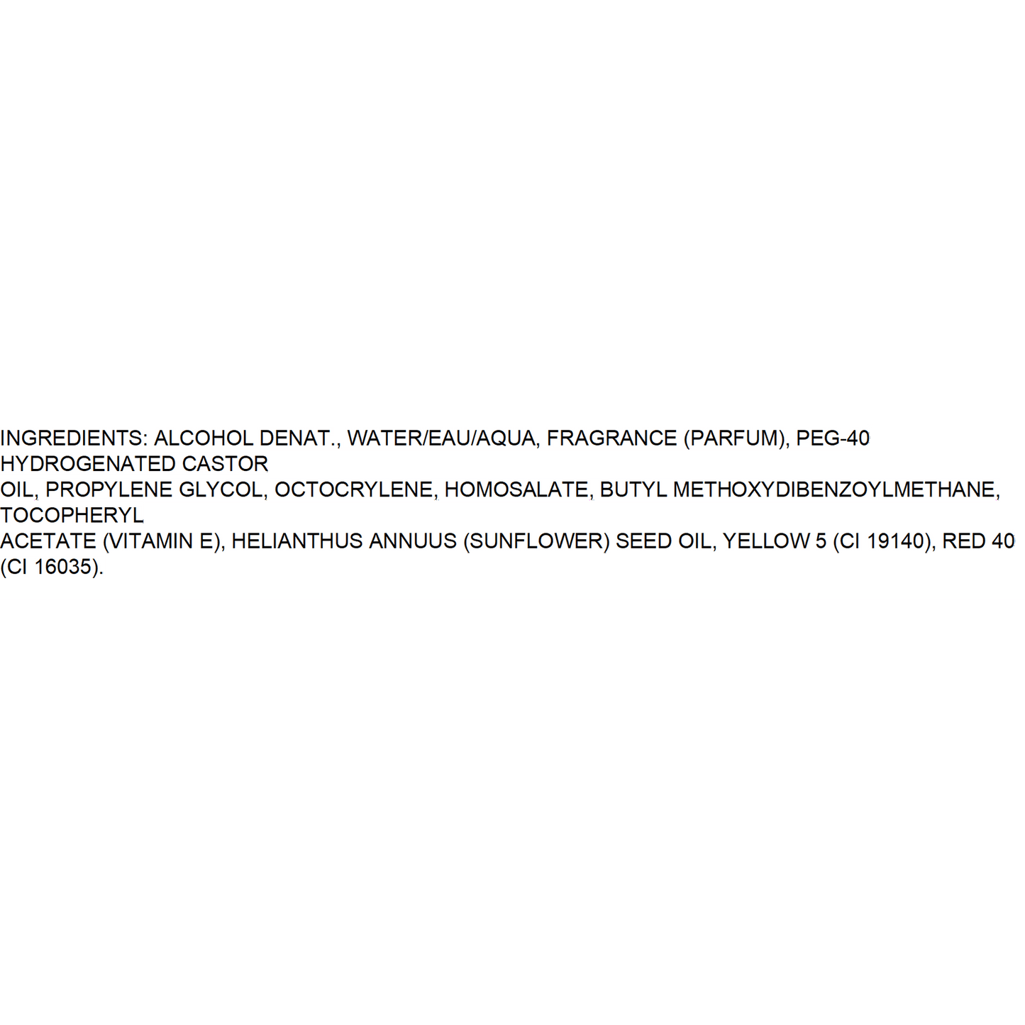 INGREDIENTS: ALCOHOL DENAT., WATER/EAU/AQUA, FRAGRANCE (PARFUM), PEG-40 HYDROGENATED CASTOR OIL, PROPYLENE GLYCOL, OCTOCRYLENE, HOMOSALATE, BUTYL METHOXYDIBENZOYLMETHANE, TOCOPHERYL ACETATE (VITAMIN E), HELIANTHUS ANNUUS (SUNFLOWER) SEED OIL, YELLOW 5 (CI 19140), RED 40 (CI 16035).