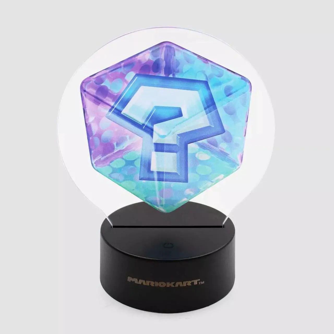 - IN THIS BOX: 1) Item Box LED light, 2) Blue shell figurine, 3) 5-panel cap, 4) Banana peel plush, 5) Mario Kart tires coaster set, 6) Keychain