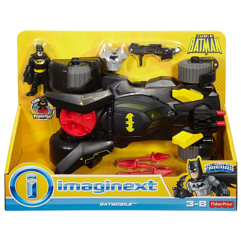 How does Batman keep the streets of Gotham City safe? With his tricked-out Batmobile of course! Open the cockpit and place Batman inside to start cruising for signs of trouble. Spread the wings of the Batmobile to flaunt the bat emblem and show Super-Villains who s boss in this town. Uh oh Batman s under attack! Turn the Power Pad to the left to activate the shields and rotate the cannons. Ready...aim...fire! Turn the Power Pad to the right to fire the missiles. With sleek black and yellow colors and a built-in missile launcher this power-packed vehicle is sure to rev up kids imaginations as they zoom from one exciting battle to the next. Imagine What s Next! Where development comes into play Cognitive: Imaginative play and storytelling helps kids develop language skills and can foster an early love for reading.