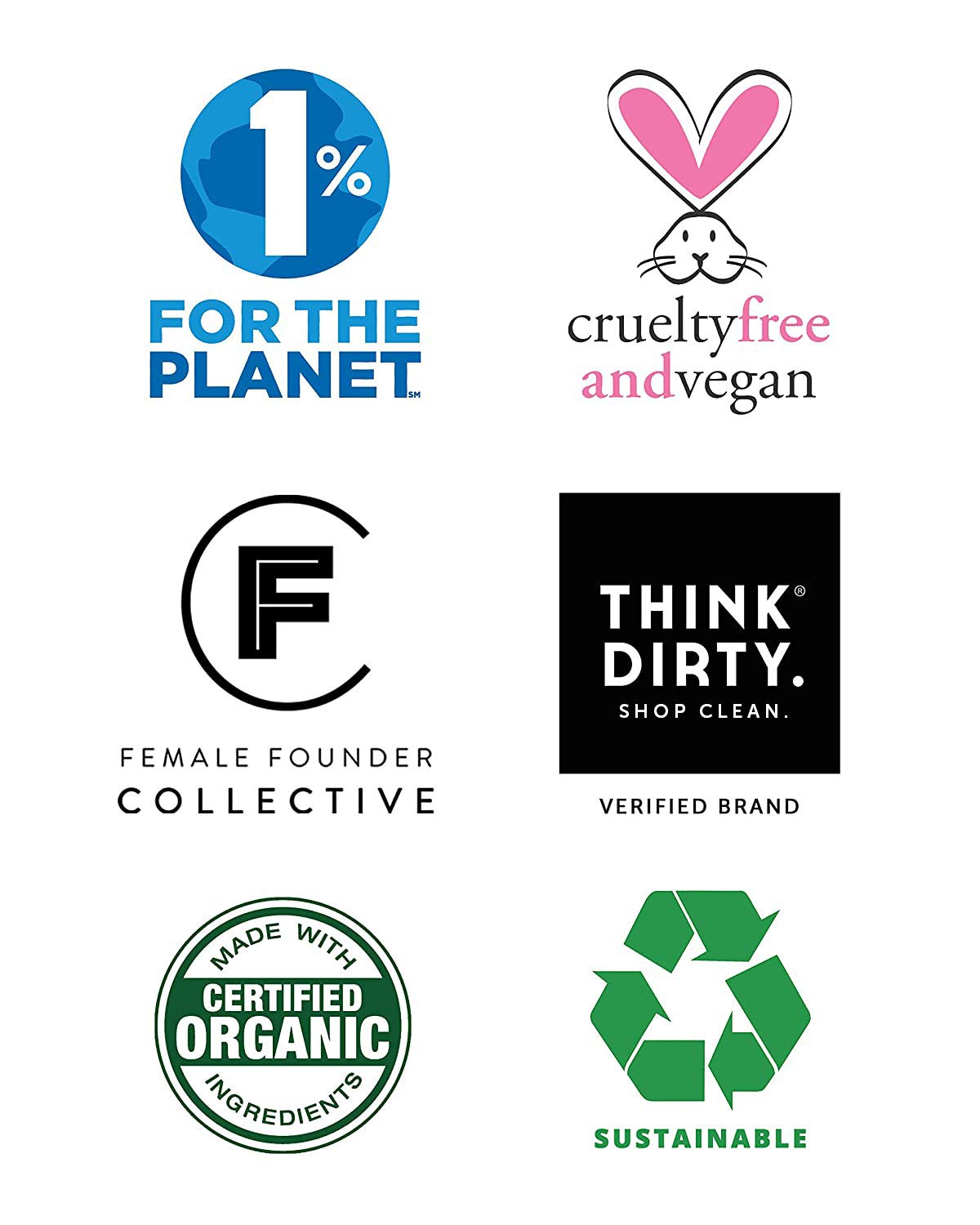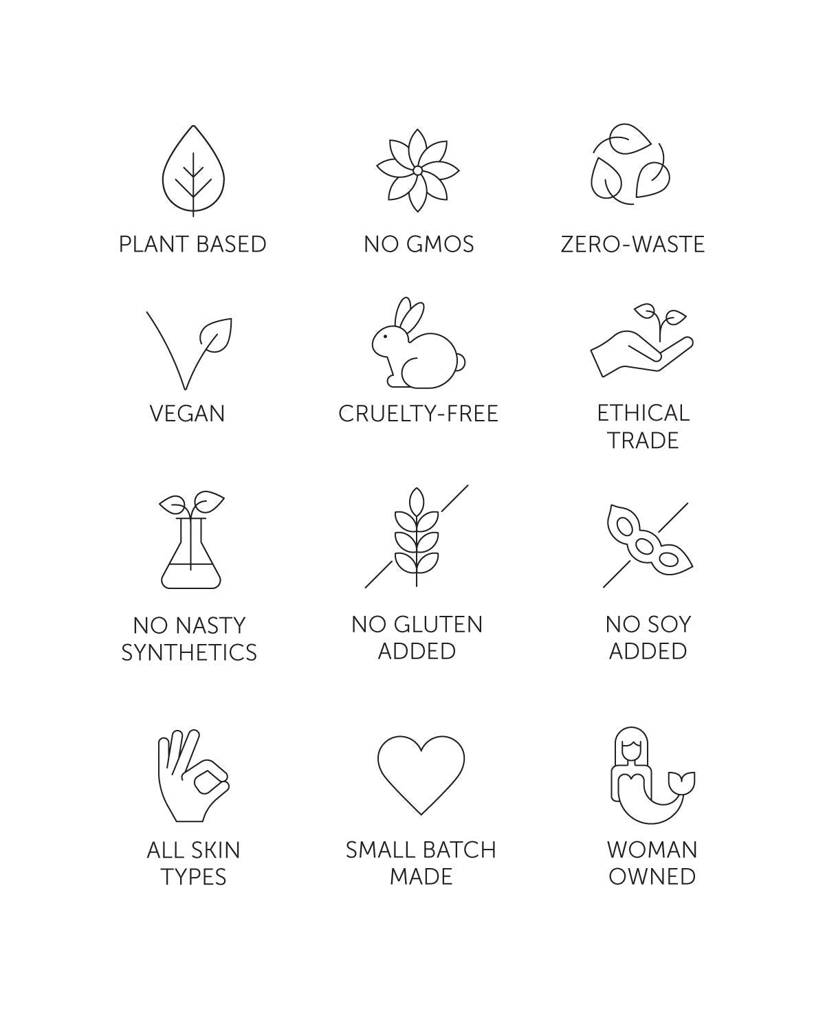 Purely Natural · Ethical · Sustainable · No Nasty Synthetics · Vegan · Cruelty-Free · 100% Non-GMO / Organic / Wildcrafted · Nontoxic · Fair Trade · No Gluten Added · No Soy Added · No Fillers · Plant—Based · Food-Grade · pH Optimized · Scientifically-Proven Ingredients · Therapeutic-Grade · Zero-Waste · Woman—Owned · Small Batch Made By USA Mermaids · 1% For The Planet®