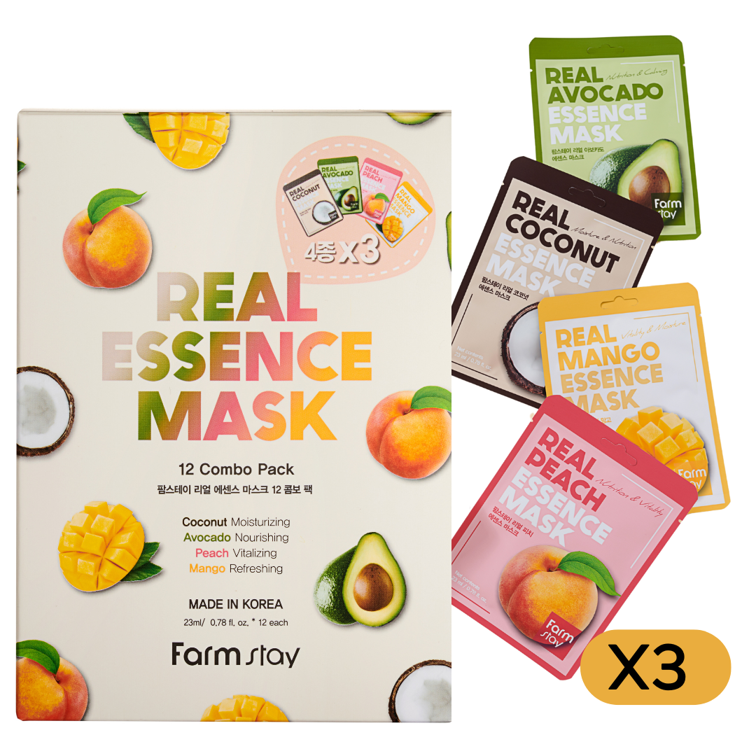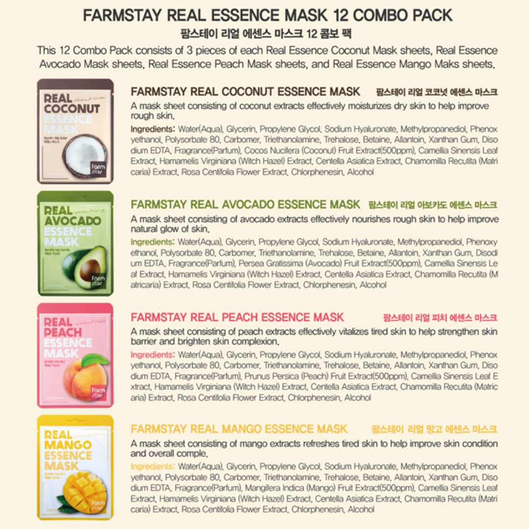FARMSTAY Real Essence Facial Sheet 12 Pack Korean Skincare Mask Combo (Coconut, Avocado, Peach, Mango)