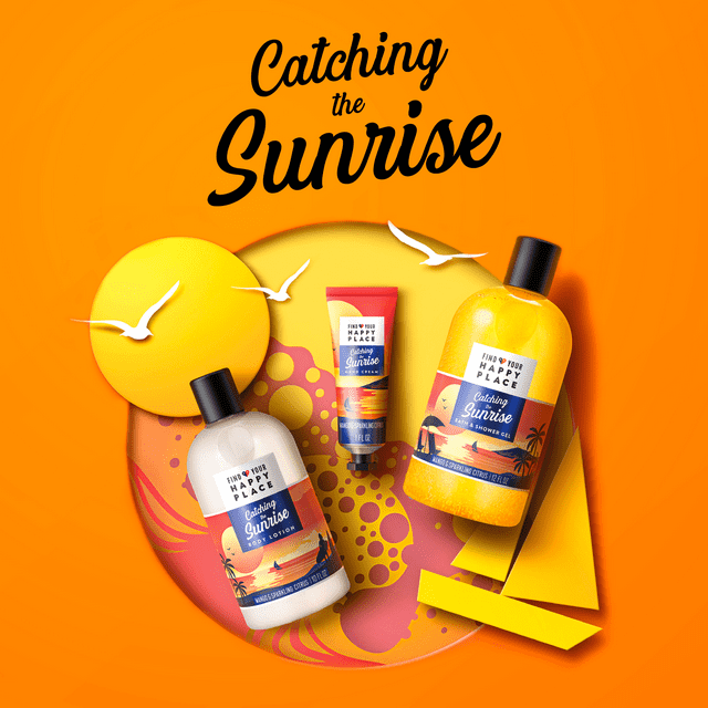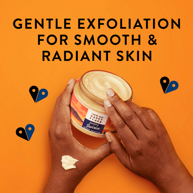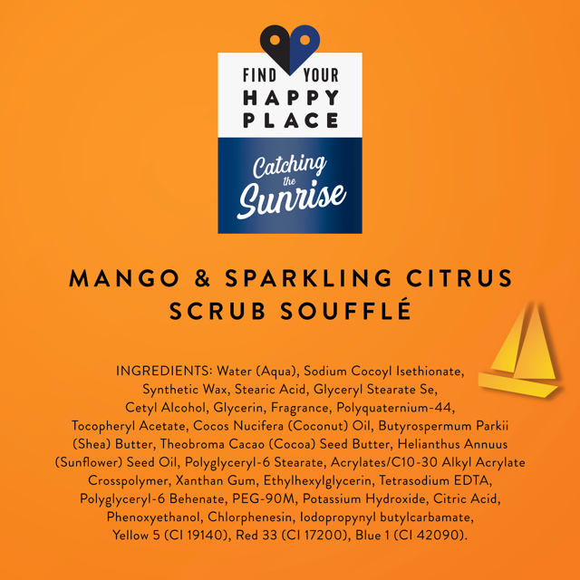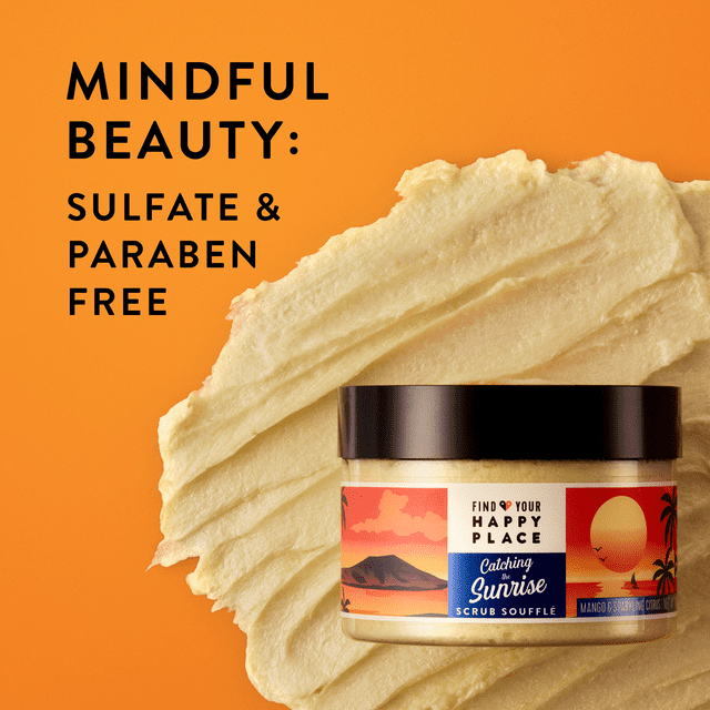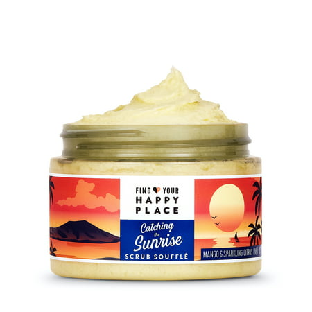 Discover a new day with Find Your Happy Place Body Scrub Souffle Catching the Sunrise 10 oz. Scented with sparkling pink grapefruit sweet mango wild pineapple and golden amber this whipped body scrub buffs away dry dull skin to reveal a smooth and radiant glow. This nourishing formula is sulfate and paraben-free with a 3X blend of shea butter cocoa butter and vitamin E. To use simply scoop the scrub souffle with your hands and gently massage it onto your dry skin in small circles. This gentle exfoliating body scrub is best paired with the complete Catching The Sunrise collection for an immersive sensory experience.