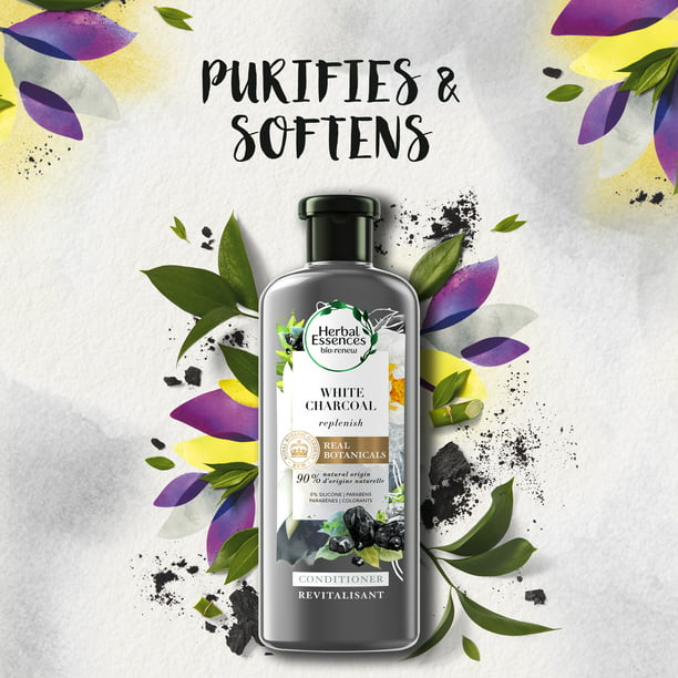 Help restore hairs natural moisture with Herbal Essences Replenish White Charcoal Conditioner. Our real botanicals are endorsed by Royal Botanic Gardens, Kew, a leading expert on plants. This conditioner, with real botanicals, moisturizes and soothes hair from root to tip. Crafted with our signature blend of real botanicals, White Charcoal Conditioner hydrates hair while helping to protect from damage and breakage. Color-safe and pH-balanced, this conditioner moisturizes hair while infusing notes of lavender, juicy citrus, and cocoa into your hair leaving it hydrated, soft, and shiny. Work into hair, rinse and repeat with ease knowing your conditioner is paraben-free, silicone-free and colorant-free, and made with at least 90% natural-origin ingredients. Purified water and natural-source ingredient materials with limited processing.