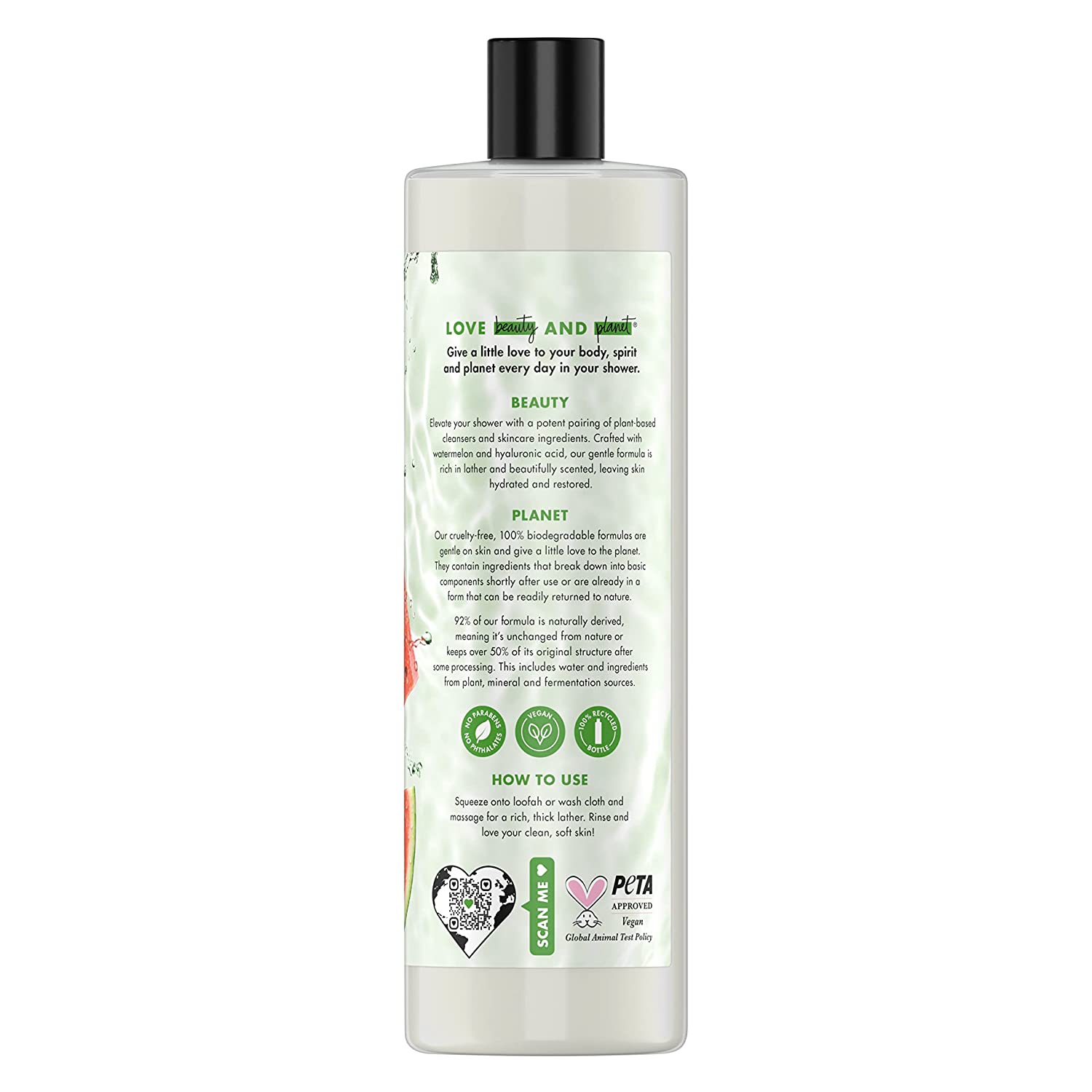 Elevate your shower and skincare routine with Love Beauty and Planet Watermelon and Hyaluronic Acid Plant Based Body Wash infused with plant based cleansers and skincare ingredients. Crafted with watermelon and hyaluronic acid, our gentle body cleanser is rich in lather and beautifully scented, leaving skin hydrated and restored. Our vegan body wash is 92 percent naturally derived and made with no sulfate cleansers, no parabens, no phthalates, no silicones and no dyes. We do not test on animals anywhere in the world and are PETA Approved Vegan. Each biodegradable formula is packed into a bottle that is made from 100 percent recycled material, and is recyclable, for a body wash that leaves you and the planet a little more beautiful. How to use Squeeze onto loofah or wash cloth and massage for a rich, thick lather. Rinse and love your clean, soft skin We are committed to small acts of love that make you and our planet a little more beautiful, every day. Our goal is a carbon footprint so small, it's like we weren't even here. We started our journey by crafting our body wash products with mild cleansers and naturally derived goodness, and continue to elevate our products without sacrificing our commitment to the planet. At Love Beauty and Planet, we're starting a beautiful movement. Are you in?