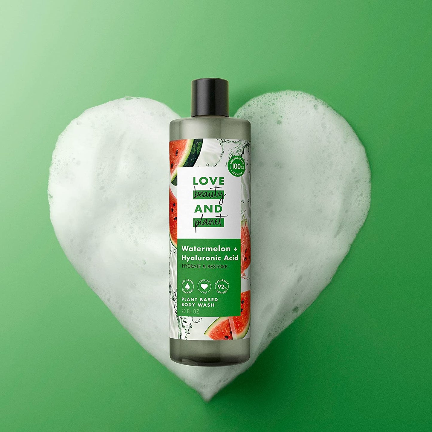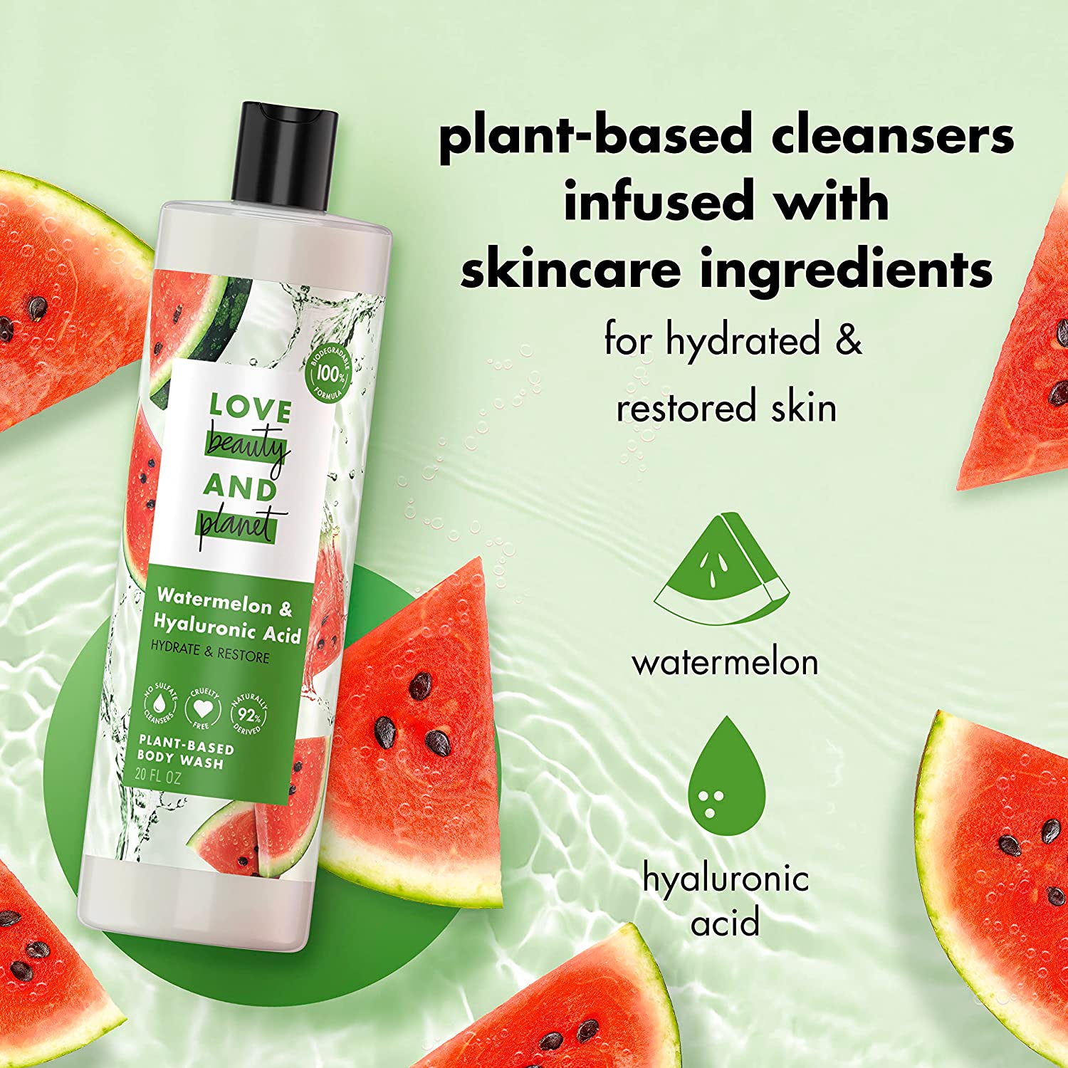 - PLANT-BASED CLEANSERS & SKIN CARE INGREDIENTS: Love Beauty and Planet Watermelon & Hyaluronic Acid Plant-Based Body Wash is rich in lather and beautifully scented, leaving skin hydrated and restored