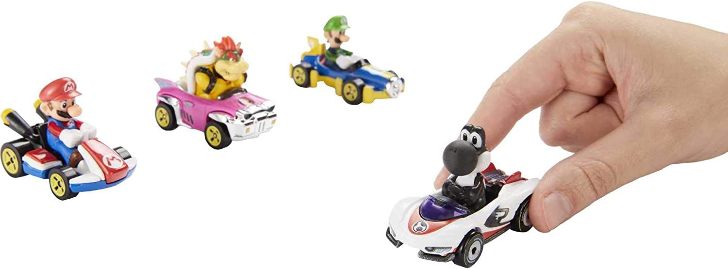 This 4-Pack of Mario Kart replica 1:64 die-cast karts will delight Mario Kart and Hot Wheels fans of all ages! The 4-Pack includes top favorite iconic Mario Kart characters and one exclusive Black Yoshi! Kids can power-up their imagination by combining the thrill of Hot Wheels performance with the action and racing of Mario Kart. Speed off and perform crazy stunts with Mario, Luigi, Bowser, and the exclusive Black Yoshi! All Mario Kart die-cast vehicles are compatible with existing Hot Wheels track sets. Each sold separately.