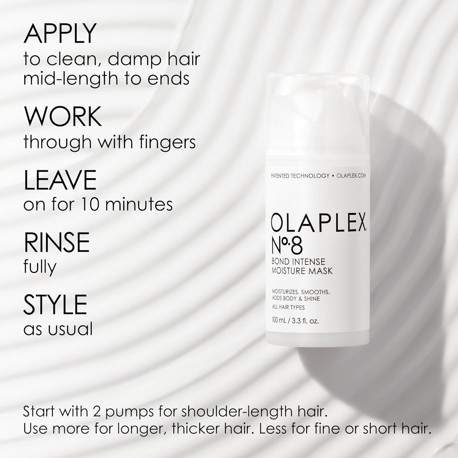 -Start with two pumps for shoulder-length hair.