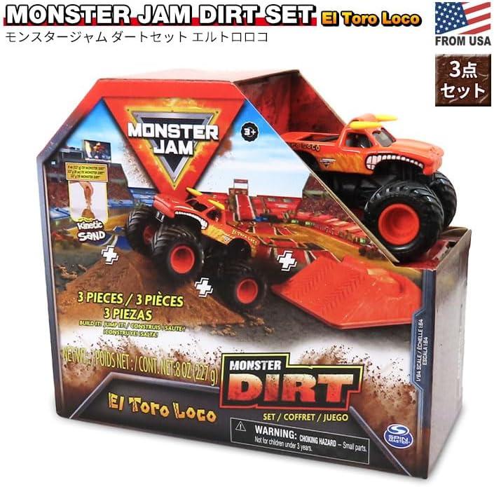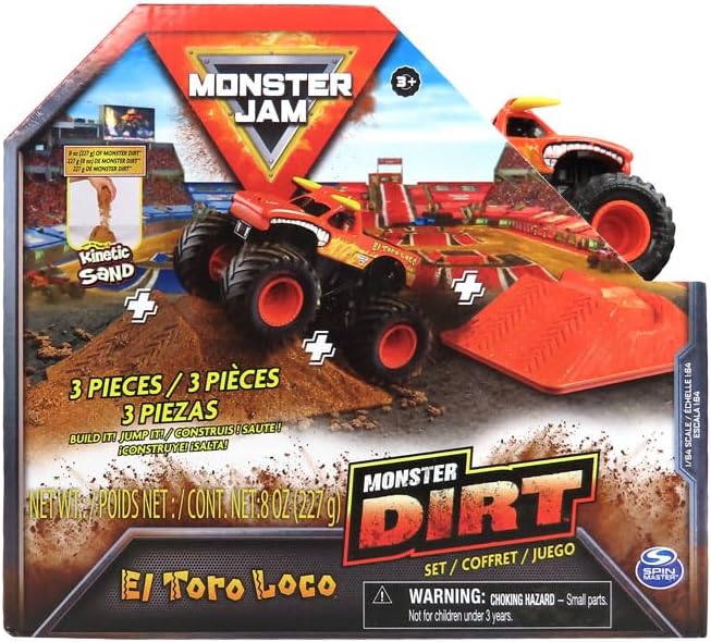 BUILD IT! JUMP IT! DO IT AGAIN! Introducing the Monster Jam Monster Dirt Set! From the makers of Kinetic Sand comes life-like Monster Dirt that mimics real Monster Jam conditions! This gritty starter set adds a new level of fun and a whole new way to play with all your favorite Monster Jam trucks. Mold, build, and jump over realistic dirt ramps with a 1:64 scale El Toro Loco die-cast Monster Jam monster truck! This lean, mean, Monster Jam machine is a must-have for your monster trucks collection, with authentic details and graphics and BKT Tires! Use the included launch ramp mold right out of the box or use it mold and build your own Monster Dirt ramp for fast, high-flying action! When you're not playing, the launch ramp doubles as a storage container. Monster Jam monster truck toys are the perfect gifts for kids ages 3 and up. Start your own Monster Jam event with the Monster Dirt Set!