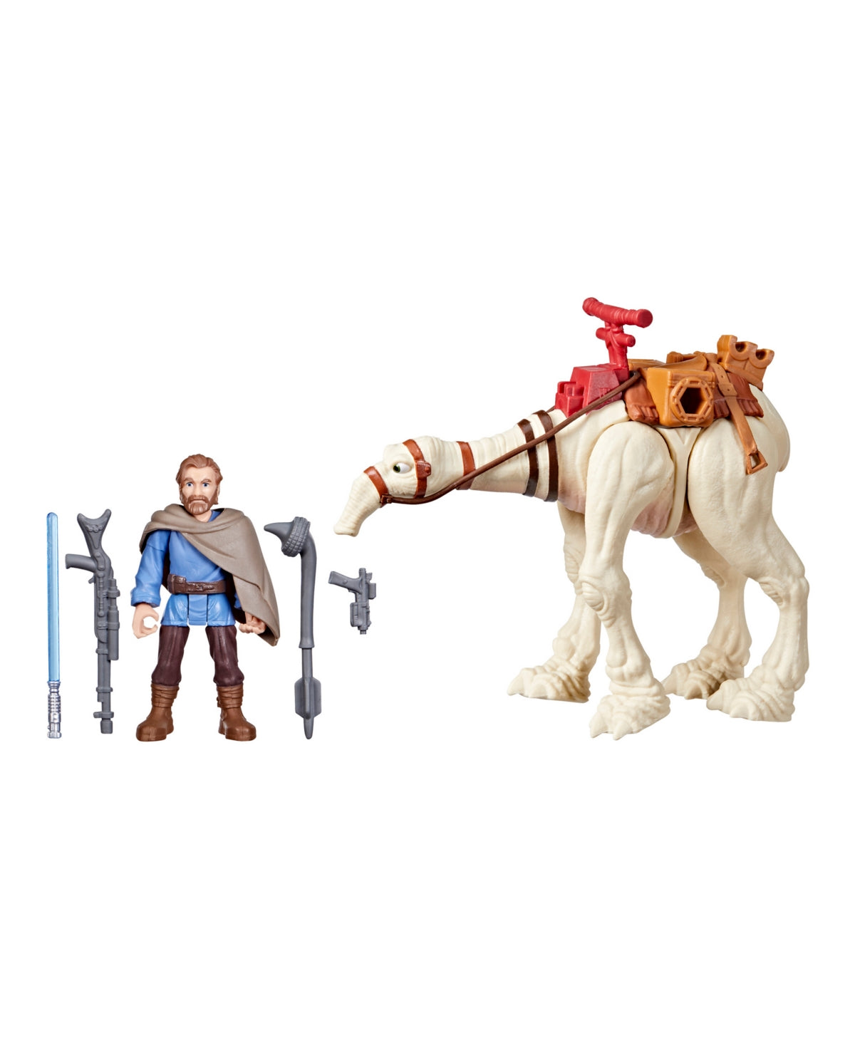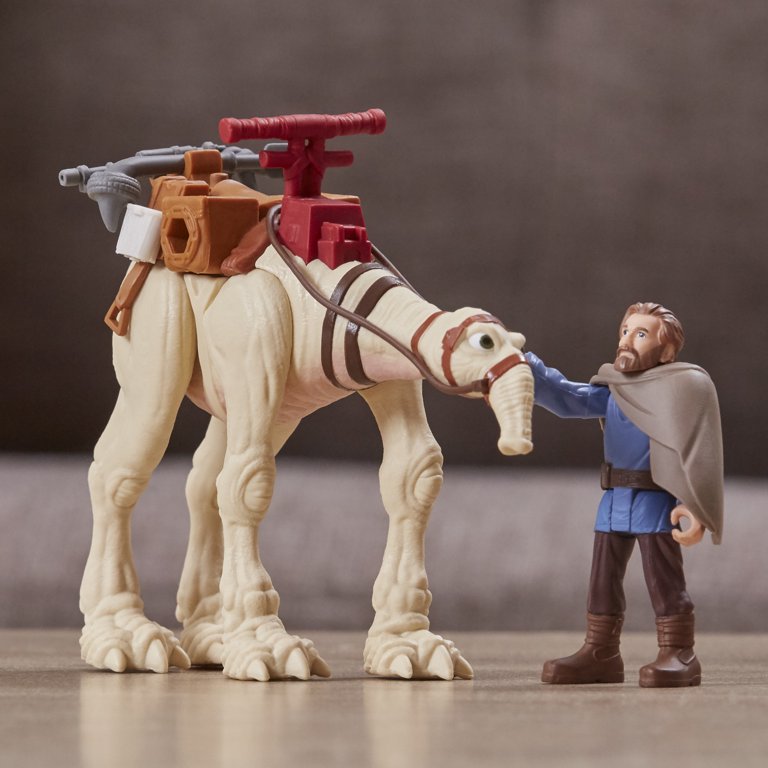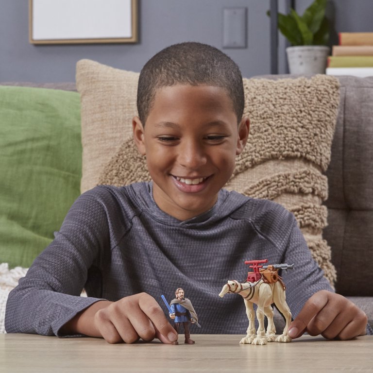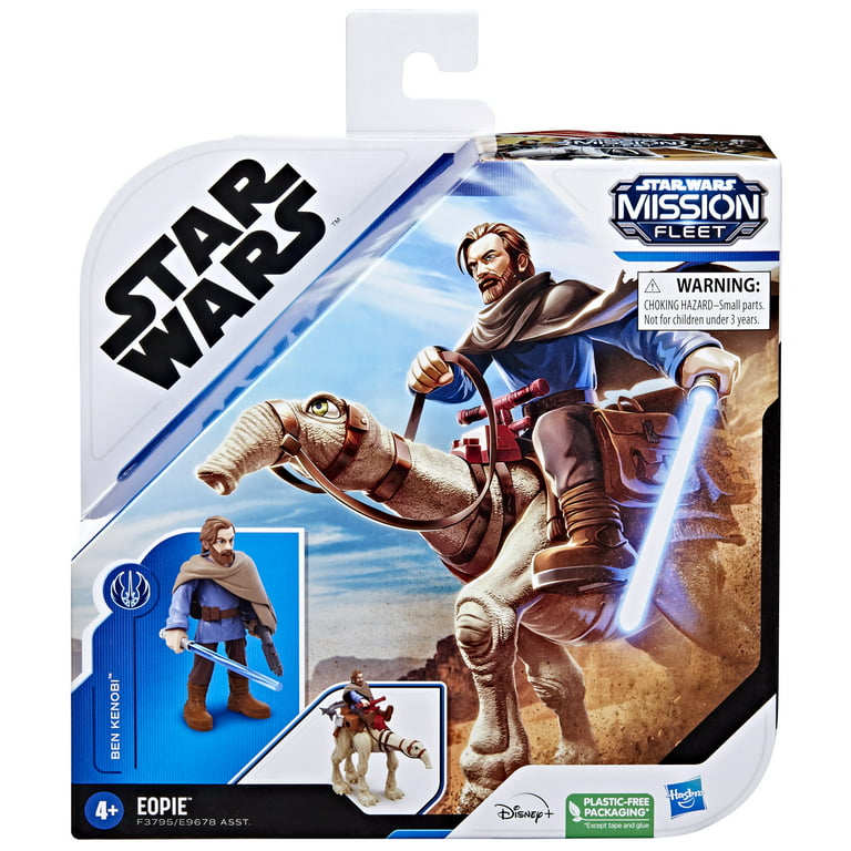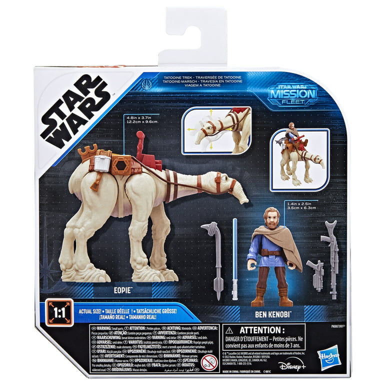 Blast off into galactic action with the Star Wars Mission Fleet Tatooine Trek figure set! This Star Wars toy includes a 2.5-inch-scale Ben Kenobi action figure with fully poseable arms, legs, and head, as well as design and detail inspired by the Obi-Wan Kenobi live-action series on Disney+. Kids ages 4 and up will love to recreate their favorite Star Wars Galaxy moments with the 4 included accessories -- a blue lightsaber accessory, 2 blaster accessories, and a staff. Plus, this Obi-Wan Kenobi toy comes with an eopie figure for transport that features a moveable neck and attached saddle.